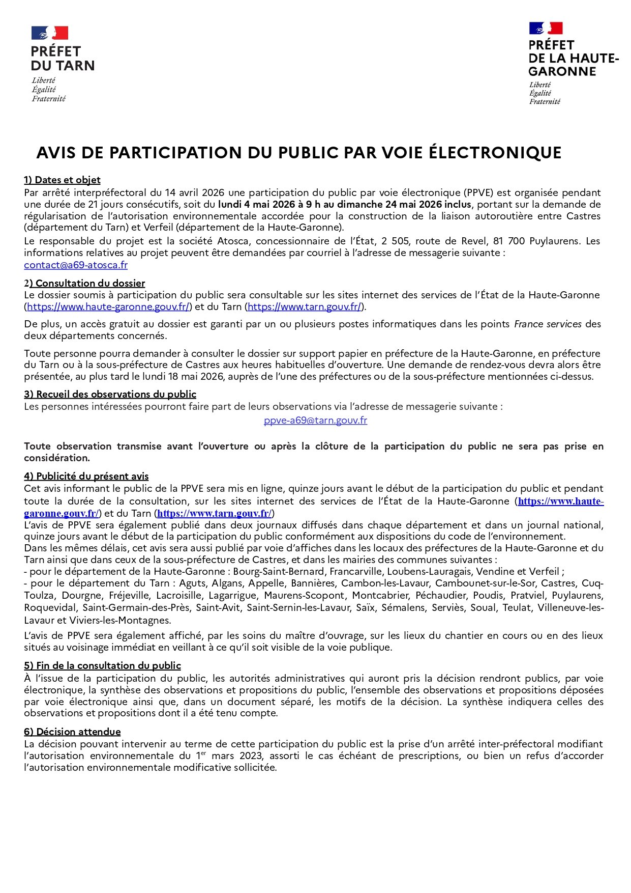 Ouverture d'une participation du public par voie électronique (PPVE) qui se déroulera du lundi 4 mai au dimanche 24 mai inclus, elle portera sur la demande de régularisation de l’autorisation environnementale accordée pour la construction de la liaison autoroutière entre Castres (département du Tarn) et Verfeil (département de la Haute-Garonne).