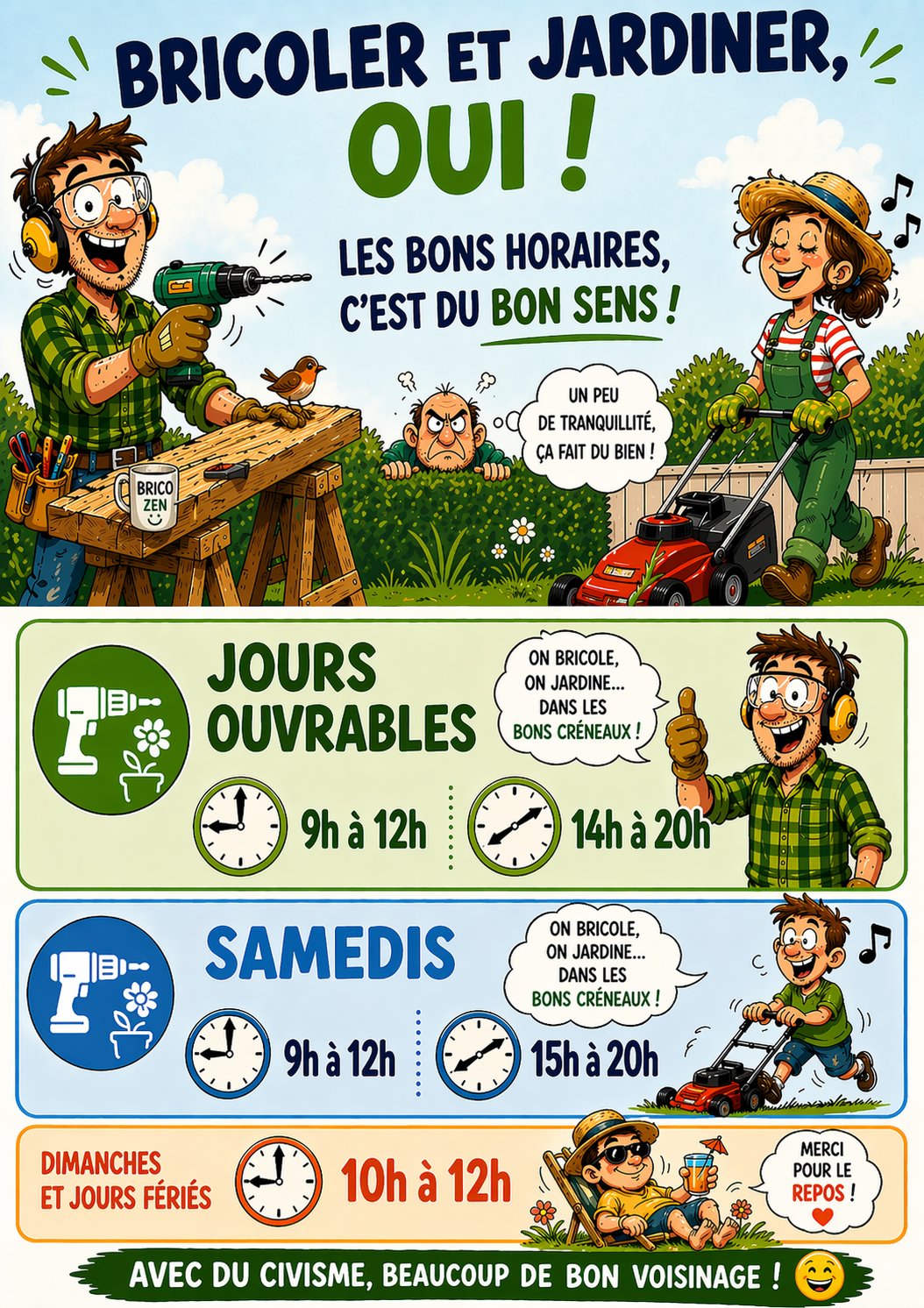 đNous vous rappelons que « les travaux dâentretien, de bricolage ou de jardinage rĂ©alisĂ©s PAR DES PARTICULIERS en dehors de tout cadre professionnel, et Ă lâaide dâoutils ou dâappareils susceptibles de causer une gĂȘne pour le voisinage en raison de leur intensitĂ© sonore, sont soumis Ă la lĂ©gislation ». đ đȘđȘ”đ±