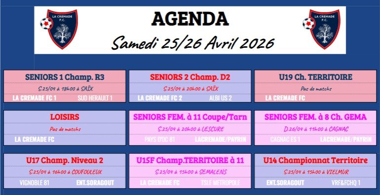 Ci joint l'AGENDA FOOTBALLISTIQUE du 25 et 26 AVRIL 2026.